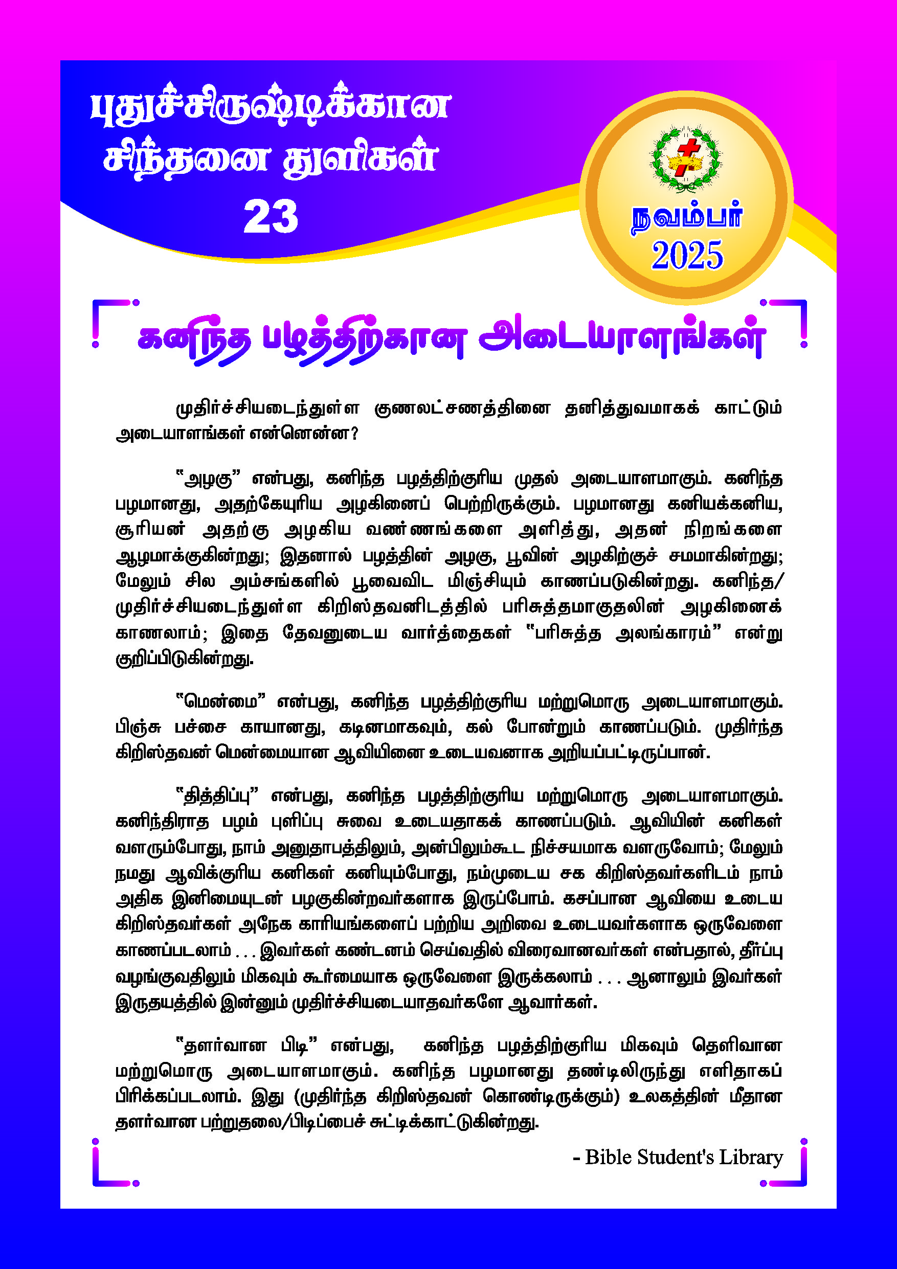 “அழகு” என்பது, கனிந்த பழத்திற்குரிய முதல் அடையாளமாகும். கனிந்த பழமானது, அதற்கேயுரிய அழகினைப் பெற்றிருக்கும். பழமானது கனியக்கனிய, சூரியன் அதற்கு அழகிய வண்ணங்களை அளித்து, அதன் நிறங்களை ஆழமாக்குகின்றது; இதனால் பழத்தின் அழகு, பூவின் அழகிற்குச் சமமாகின்றது; மேலும் சில அம்சங்களில் பூவைவிட மிஞ்சியும் காணப்படுகின்றது. கனிந்த / முதிர்ச்சியடைந்துள்ள கிறிஸ்தவனிடத்தில் பரிசுத்தமாகுதலின் அழகினைக் காணலாம்; இதை தேவனுடைய வார்த்தைகள் “பரிசுத்த அலங்காரம்” என்று குறிப்பிடுகின்றது.